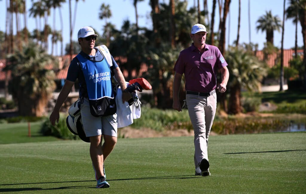 Jan 20, 2022; La Quinta, California, USA; Brandt Snedeker (right) and caddie Scott Sajtinac walk the 18th fairway during the first round of the American Express golf tournament at La Quinta Country Club. Mandatory Credit: Orlando Ramirez-USA TODAY Sports